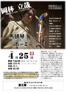 ■4月25日(日) 【時】15時半開場 16時開演 【所】豆工房 長野県松本市蟻ケ崎6−8−1 【金】2,500円(コーヒ&ケーキ付き) ※定員20名です。お早目にご予約ください。 【予約・問】0263−33−9123 […]